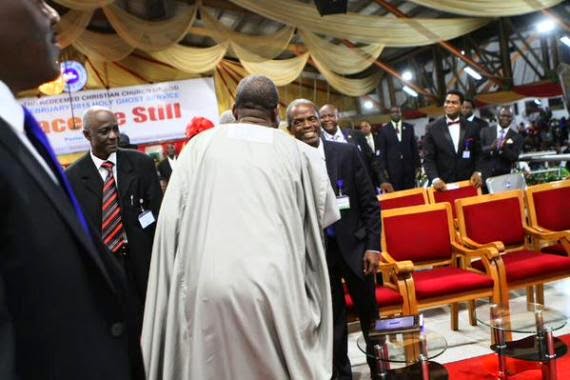 Nigerian President, Dr Goodluck Jonathan visited The Redeemed Christian Church of God, Redemption Camp today where Pastor E.A Adeboye prayed for him. As evidenced in one of the pictures, he also met the APC VP candidate Prof. Osinbajo there and they shook hands. (Photo credit: LIB)