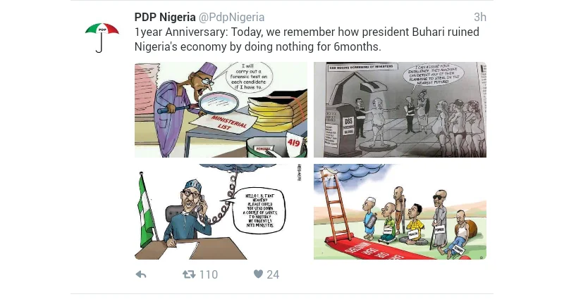 The Peoples Democratic Party, PDP, has expressed its views on President Muhammadu Buhari’s One Year In office. Using cartoons, the party mocked the president.