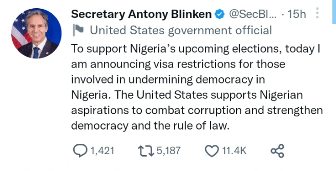The statement read: “We are committed to supporting and advancing democracy in Nigeria and around the world. Today, I am announcing visa restrictions on specific individuals in Nigeria for undermining the democratic process in a recent Nigerian election.